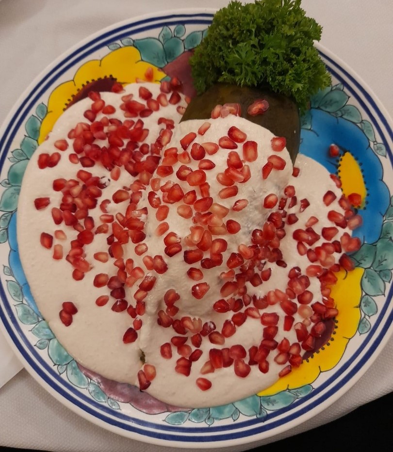 The creamy dressing (nogada) that covers the poblano pepper is made of a combination of local goat cheese, double cream, walnuts and sherry. The mixture is a creamy cheese sauce in a base of walnuts. Also seasonal, are the pomegranate seeds that are used to top off the dish, being both a flavorful ingredient and decoration. Parsley (cilantro) also tops off the creamy poblano dish.